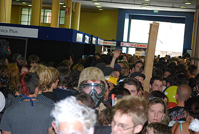 Which makes it a strange dichotomy, because despite that, they jump at the chance of an event like Supanova, at dressing up, at getting up there, at being creative and showing the world. They might be on the cutting edge of consumerism, but they’re deeply loyal to their loves, and it was like one great big costume party in the anime theatre, only no-one came dressed as Marilyn Monroe or Elvis Presley. No, they came dressed as Chi and Vash the Stampede and Urahara and even a Hollow. They bounced around like heroines from Revolutionary Girl Utena and Blood the Last Vampire (the series, thanks). They fluffed Sakura Wars skirts and straightened Akatsuki capes and tightened State Alchemist gloves and tried not to clock anyone in the head with their five foot Gunblades.